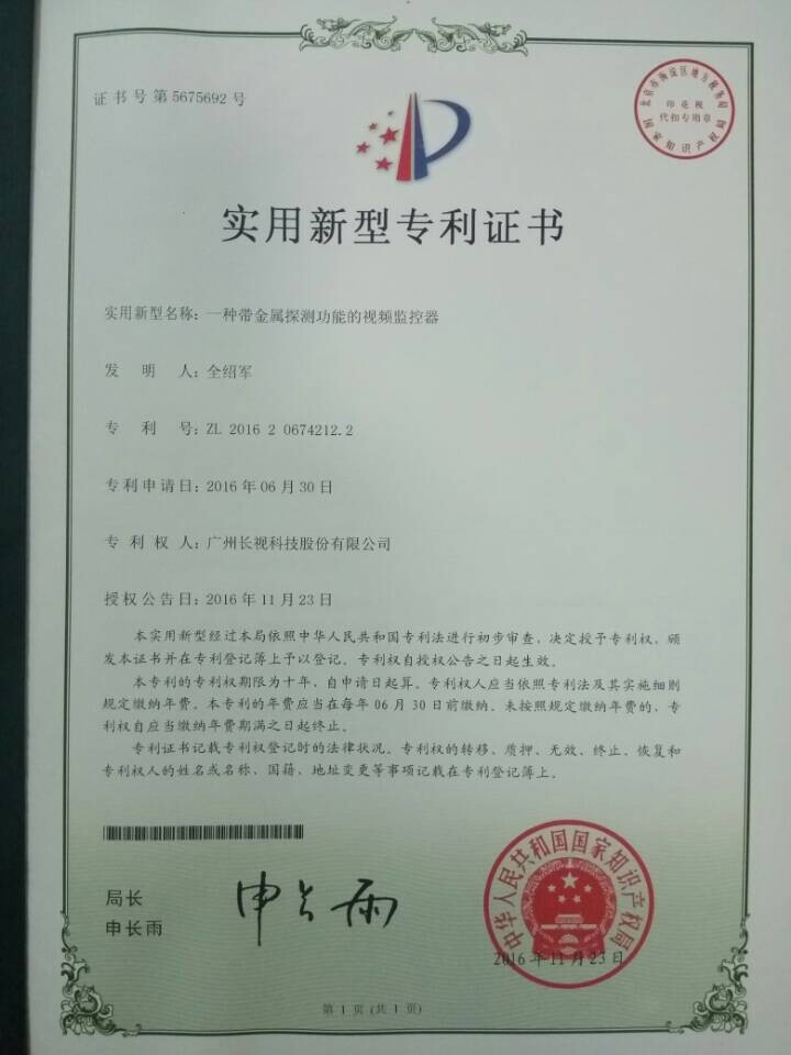2016年12月20日,長視科技榮獲兩個實(shí)用新型專利證書和一個外觀設(shè)計專利證書。
